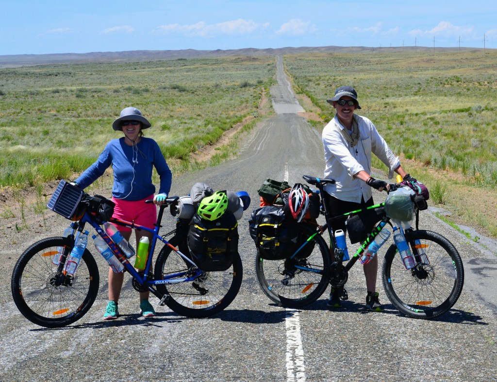 Matt and Jess cycling around the world with the bagpipes